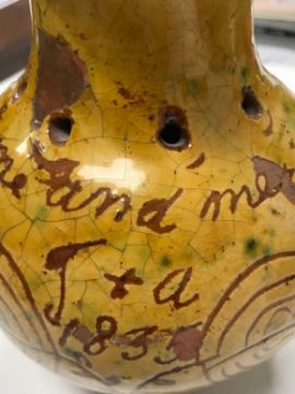 sgraffito decorated with stylised tulips, with the inscription, 'Drink of me and merry be, I M 1835', the centre with the initials, 'J & A 1835'.