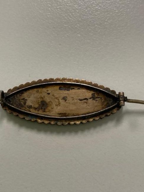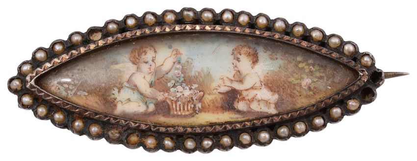 A late 18th century navette shaped gold brooch the central glazed locket compartment painted on ivory with two putti arranging a flower basket, half pearl border, (some half pearls deficient)  width 4.1cm, 6.0gCondition:IMPORTANT NOTEThis item has been registered as exempt from the UK Ivory Act 2018. Ivory declaration submission number reference: 31NKBPBP