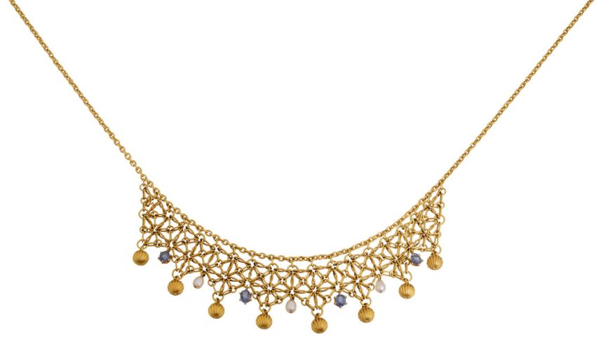 An early 20th century yellow gold and gem-set fringe necklace, the front mesh with alternating lobed spheres, circular-cut sapphires and seed pearls to the trace link back chain and barrel clasp