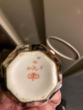 the pair with domed covers and flame finials, decorated with floral reserves and scrolling gilt decoration, S&H crossed swords mark painted in puce, a Sampson Hancock miniature Imari jug, a Royal Crown Derby' Old Imari' 1128 pattern pin dish, a Minton miniature pot and cover, a 19th century christening mug painted with floral bouquets and named Caroline Smith 1858 and a German Kaiser porcelain cobalt blue trumpet shaped vase, decorated with a floral reserve, (7)
