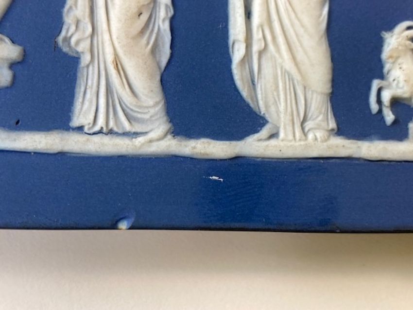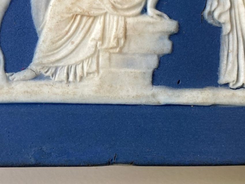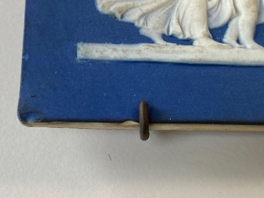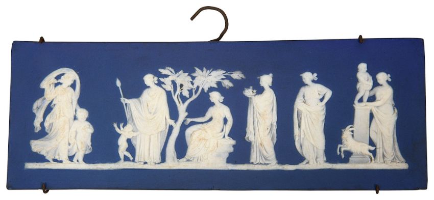 rectangular, deep blue ground, applied in relief with Grecian figures, impressed Wedgwood, hanging wire