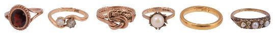 including a high carat wedding band with indistinct marks, 9ct gold and garnet ring, 18ct colourless paste set two stone cross over ring, twisted knot ring with indistinct mark '9', 9ct gold and half pearl ring marked '9.375', a half pearl and colourless paste ring (6)