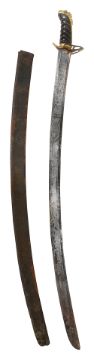 Condition:Corrosion and pitting to blade particularly towards point. Loss to hilt, knuckle guard absent, Small chip and loss to grip. Scabbard is dry and cracking. Tip of scabbard absent with losses