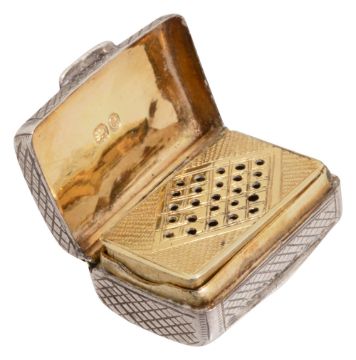 rectangular oval form, bright cut engraved with a field of diapers and central wreath framed reserve bearing initials, hinged cover with thumbpiece enclosing a gilt interior with hinged pierced grille