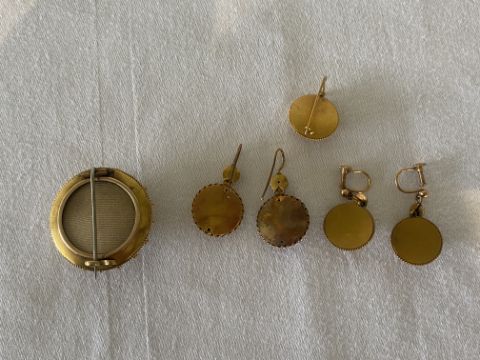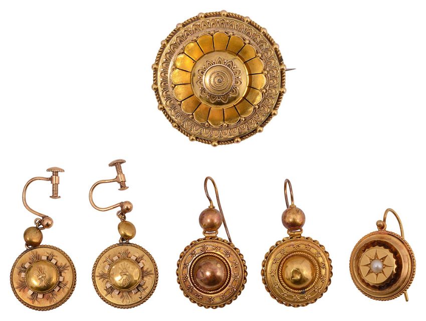 Various items of mid Victorian yellow gold Etruscan Revival jewellery: the circular locket brooch with applied decoration, and a glazed compartment to the reverse; two pairs of pair pendants , and a single ear pendant centrally-set with a pearl, (6)brooch diameter 3.4cm, total weight 23.8gCondition: Generally good/very good except for middle pair of ear pendants each with a dent to the central dome (see photo)