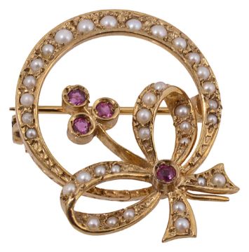 of openwork circular ribbon and floral bow design, set with half pearls and circular-cut rubies, to the 9ct yellow gold hallmarked setting