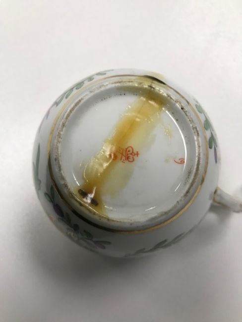 Condition:Gilt decoration rubbed. Three cups with hairline cracks, one with stapled repair and visible glue. One saucer with a hairline crack. Gilt decoration fresher on two saucers.