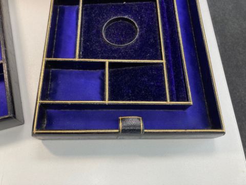 trellis embossed with gilt tooled borders, the hinged lid with central foliate engraved gilt brass carrying handle enclosing a blue silk and velvet lined interior with two lift out trays, foliate engraved lock stamped Bramah London, with key
