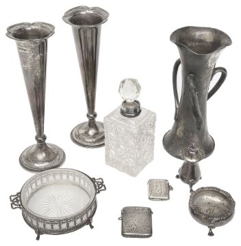 Sheffield, 1901, by Walker & Hall, trumpet from with petal shaped rims, on spreading circular weighted bases, a pierced twin handled butter dish on legs with frosted glass liner, two foliate engraved vesta cases, a pepperette and cauldron salt and a silver mounted square hobnail moulded glass scent bottle and stopper, (9)