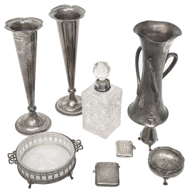 Condition:The first tarnished with knocks and scratches. One spill vase has slight lean, one lacking weight to base. Salt with corrosion spotting to interior.
