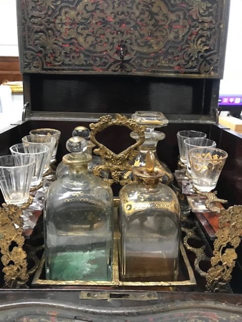 the hinging top and front inlaid with scrolling foliate arabesque panels, the interior with a grape and vine cast gilt metal frame with space for four decanters and sixteen spirit glasses, now containing nine glasses, three with gilt decoration, six facetted, a pair of decanters, a square decanter and a shaped square decanter