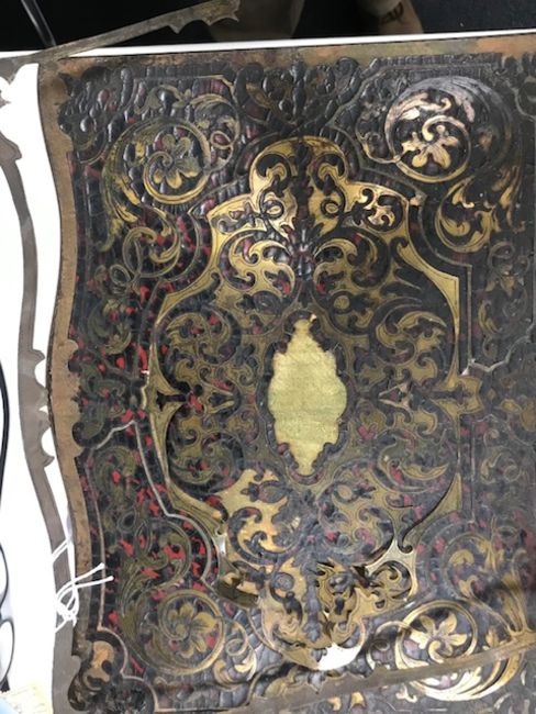 Condition:Losses to brass, brass loose to top and front. Lid loose to one side, due to warping of the top. There is a strip of brass which goes around the entire top edge of the lid which is present. Work is needed.