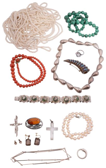 to include a Chinese silver and blue enamel fingernail guard brooch set with coral and turquoise cabochons, pair culture pearl screwback stud earrings,a Mexican tear shape panel necklace by William Spratling, a Mexican silver and green hardstone panel bracelet, an amber and silver brooch, a malachite graduated bead necklace a coral graduated bead necklace, Tiffany & Co eternal circle keyring stamped T&Co, cultured pearl single stand necklace, Israeli modernist bar link necklace etc., (qty)