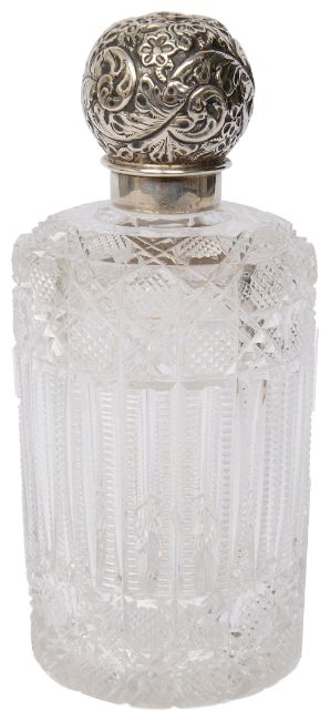 An Edwardian silver topped glass perfume bottle the moulded glass bottle with silver collar and silver screw cap with repousse scroll decoration, the cap hallmarked J G & S for Joseph Cook & Son dateheight 16cmCondition: Cap is possibly associated and later to the bottle. Stopper may also be a replacement, marks rubbed