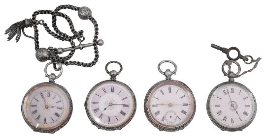 all with white enamel dials and foliate engraved cases, one with Albertina watch chain attached, (4)