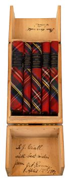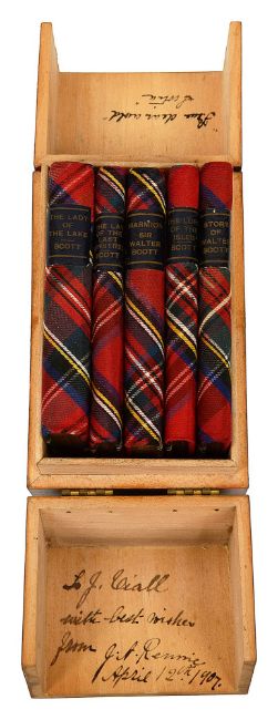 The rectangular box covered in Stuart Tartan with double hinged lid decorated with two oval reserves, one a portrait of Sir Walter Scott, the other a photographic view of Melrose Abbey, containing Scott's Poetical Works in five volumes, Glasgow, David Bryce, bound in silk, 2x 'Prince Charlie' and 3x 'Stuart'; gilt edge, each with pen dedication dated 1907