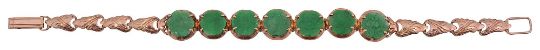 A flexible link jadeite bracelet, the middle section composed of seven articulated circular engraved jadeite discs, closed back setting, to the engraved links and deployant clasp stamped '14K' length 16cm,10.8g,  Jade stones are 8.72 x 8.52 x 1.89mmCondition:  Overall condition is Good/Very good