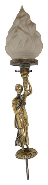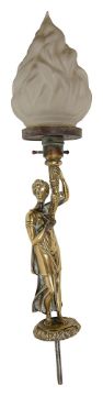 A continental cast brass figural table lamp c.1900in the form of classical maiden in flowing drapery holding aloft a cornucopia issuing a light fitting, frosted glass flame shade height 60 cm. Rod diameter 7mm, base diameter 8cmCondition: The lamp lacking base but otherwise in good condition. Flame shade with very slight chip to tip. There is a repaired break to the wrist area of the figure, visible on close examination.
