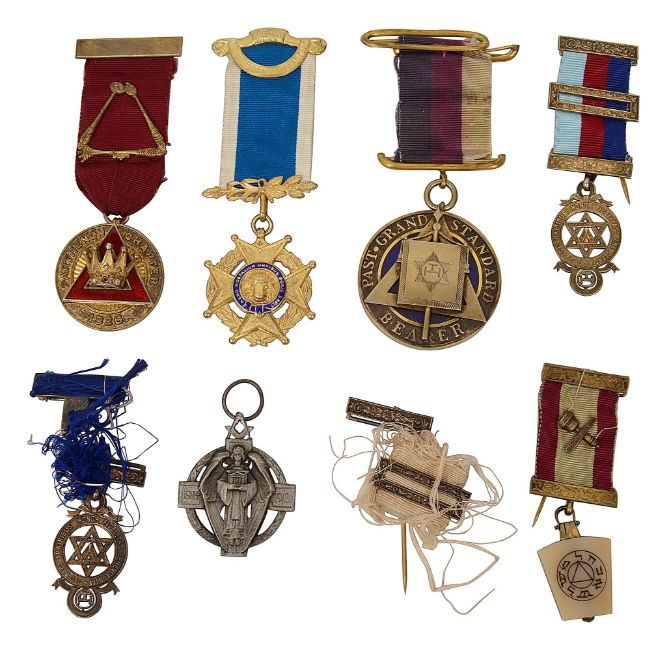 to include a Past Grand Standard Bears silver gilt and blue guilloche enamel jewel collar jewel, a 1914-18 Hallstone silver medal, a silver gilt and red enamel Parthenon Chapter 1826 medal with crown and enamel triangle, a silver gilt RAOB Dorchester Lodge medal, a hardstone keystone and two others, mostly on ribbons, (7)
