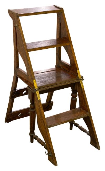 A Victorian set of oak metamorphic library stepsin the Gothic stylewith two quatrefoil pierced back rails, on facetted tapered legsheight 91cm, width 44cm, depth 46cm Condition:Seat split right across and re-affixed at some point. There are two filled in rectangular sections to the uprights, just above the seat, which look to be where there once sat side brackets. FURNITURE & LARGE ITEMS Must  be collected from the Auction venue by 1pm Friday 28th.  Please arrange transport before this deadline.   Uncollected property will be transported to our offsite storage facility and collection can be arranged by appoiment only.  Additional fees may apply