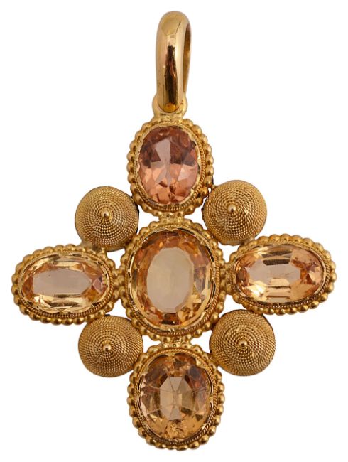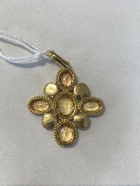 A topaz and yellow gold pendant, designed as a Greek cross, collet-set with five oval faceted topaz within a beadwork border and separated by four wirework domesoverall length including bail 4.7cm, width 3.5cmCondition:Overall condition fair/good; lowest  topaz chipped at basal edge  with sight damage to bead work below.