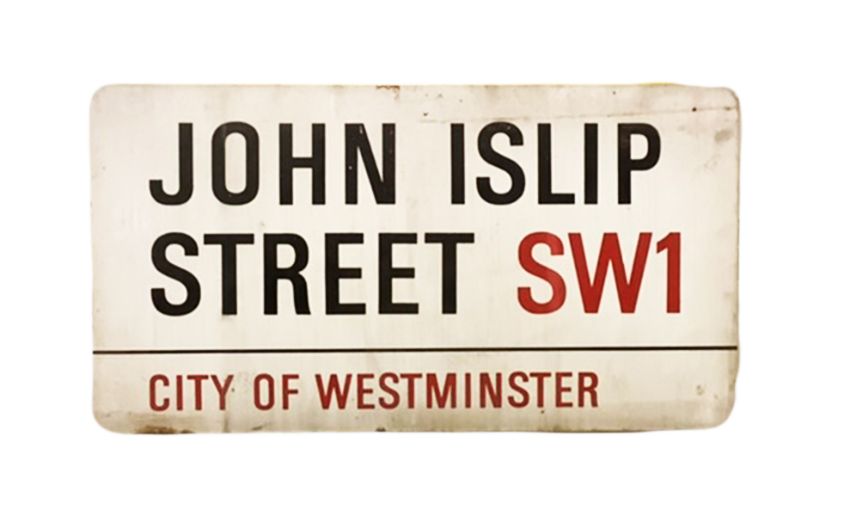 An enamelled steel street sign for John Islip Street SW1, City of Westminster with iconic black and red sans serif lettering first created by Sir Misha Black in 1967 which is unique to the Westminster signs and under copyright law, forbidden to be copied anywhere else in the world, sold together with a signed Certificate of Authenticity