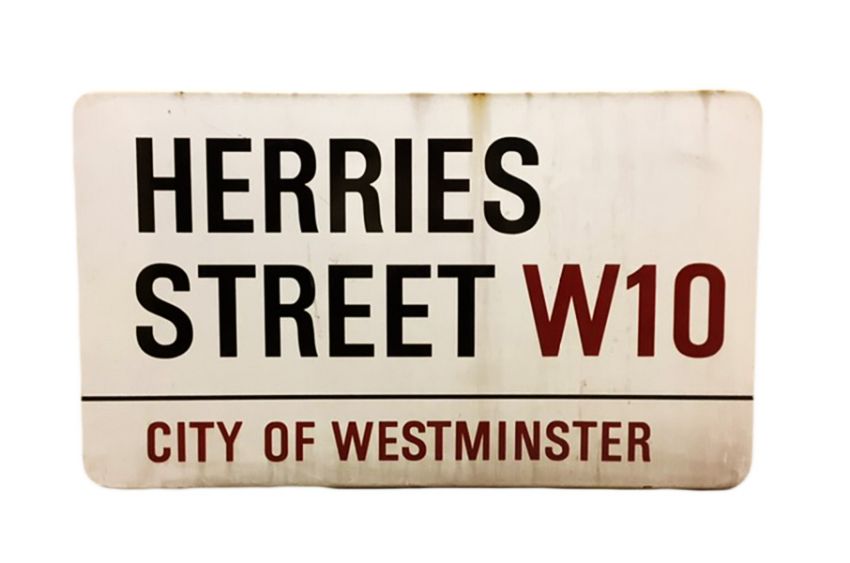 An enamelled steel street sign for Herries Street W10, City of Westminster with iconic black and red sans serif lettering first created by Sir Misha Black in 1967 which is unique to the Westminster signs and under copyright law, forbidden to be copied anywhere else in the world, sold together with a signed Certificate of Authenticity