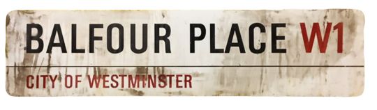 An enamelled steel street sign for Balfour Place W1, City of Westminster with iconic black and red sans serif lettering first created by Sir Misha Black in 1967 which is unique to the Westminster signs and under copyright law, forbidden to be copied anywhere else in the world, sold together with a signed Certificate of Authenticity