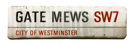 An enamelled steel street sign for Gate Mews SW7, City of Westminster