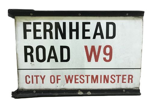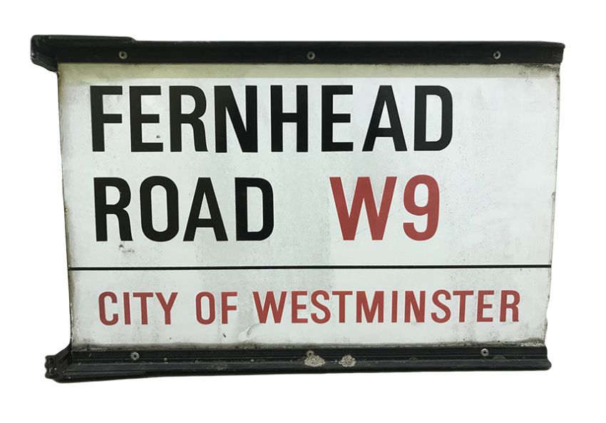 A double sided pole street sign for Fernhead Road W9, City of Westminster with iconic black and red sans serif lettering first created by Sir Misha Black in 1967 which is unique to the Westminster signs and under copyright law, forbidden to be copied anywhere else in the world, sold together with a signed Certificate of Authenticity