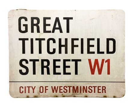 An enamelled steel street sign for Great Titchfield Street W1, City of Westminster with iconic black and red sans serif lettering first created by Sir Misha Black in 1967 which is unique to the Westminster signs and under copyright law, forbidden to be copied anywhere else in the world, sold together with a signed Certificate of Authenticity
