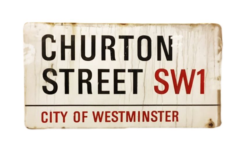 An enamelled steel street sign for Churton Street SW1, City of Westminster with iconic black and red sans serif lettering first created by Sir Misha Black in 1967 which is unique to the Westminster signs and under copyright law, forbidden to be copied anywhere else in the world, sold together with a signed Certificate of Authenticity