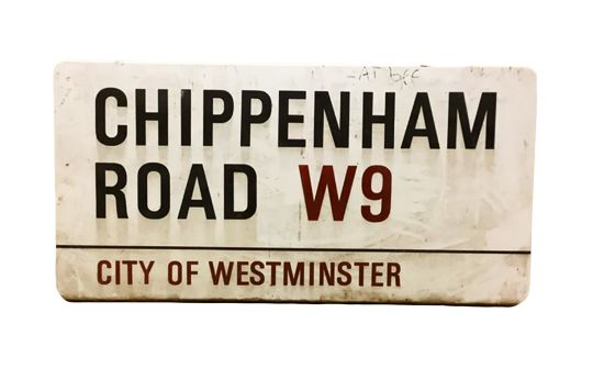 An enamelled steel street sign for Chippenham Road W9, with metal brackets, City of Westminster with iconic black and red sans serif lettering first created by Sir Misha Black in 1967 which is unique to the Westminster signs and under copyright law, forbidden to be copied anywhere else in the world, sold together with a signed Certificate of Authenticity