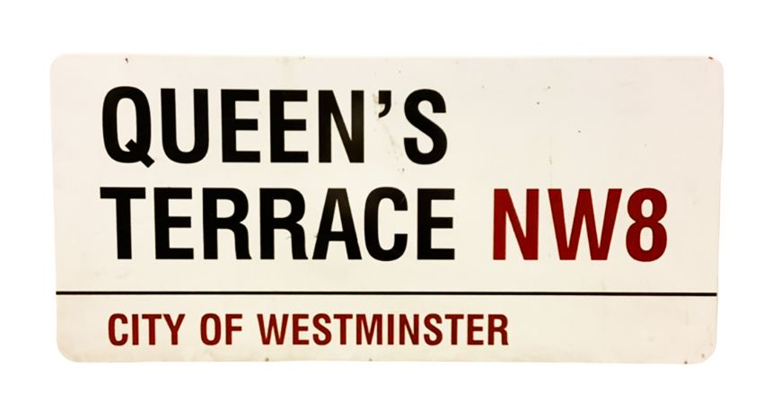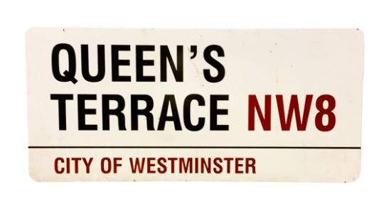 An enamelled steel street sign for Queen's Terrace NW8, City of Westminster with iconic black and red sans serif lettering first created by Sir Misha Black in 1967 which is unique to the Westminster signs and under copyright law, forbidden to be copied anywhere else in the world, sold together with a signed Certificate of Authenticity