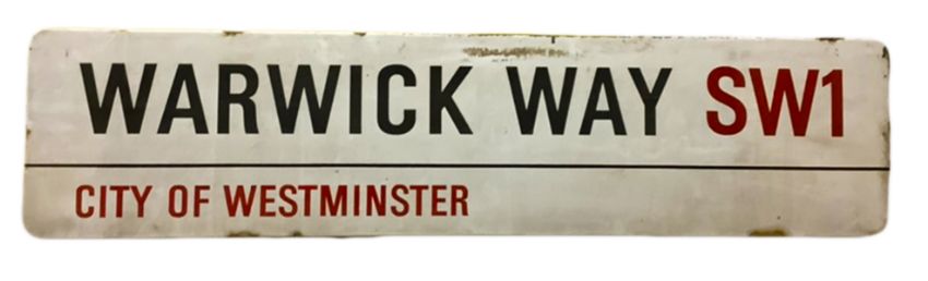 An enamelled steel street sign for Warwick Way SW1, City of Westminster with iconic black and red sans serif lettering first created by Sir Misha Black in 1967 which is unique to the Westminster signs and under copyright law, forbidden to be copied anywhere else in the world, sold together with a signed Certificate of Authenticity
