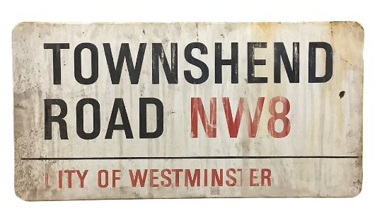 An enamelled steel street sign for Townshend Road NW8, City of Westminster with iconic black and red sans serif lettering first created by Sir Misha Black in 1967 which is unique to the Westminster signs and under copyright law, forbidden to be copied anywhere else in the world, sold together with a signed Certificate of Authenticity
