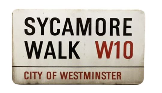 An enamelled steel street sign for Sycamore Walk W10, City of Westminster