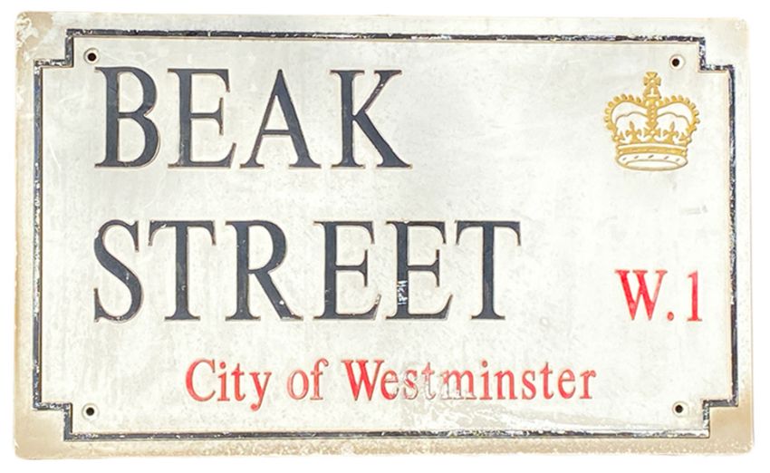 with raised black painted border, black and red painted relief lettering and gilt painted relief of the Crown Estate to top right, with four screw holes, sold together with a signed Certificate of Authenticity from Westminster City Council