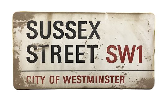An enamelled steel street sign for Sussex Street SW1, City of Westminster with iconic black and red sans serif lettering first created by Sir Misha Black in 1967 which is unique to the Westminster signs and under copyright law, forbidden to be copied anywhere else in the world, sold together with a signed Certificate of Authenticity