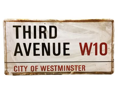 An enamelled steel street sign for Third Avenue W10, City of Westminster with iconic black and red sans serif lettering first created by Sir Misha Black in 1967 which is unique to the Westminster signs and under copyright law, forbidden to be copied anywhere else in the world, sold together with a signed Certificate of Authenticity