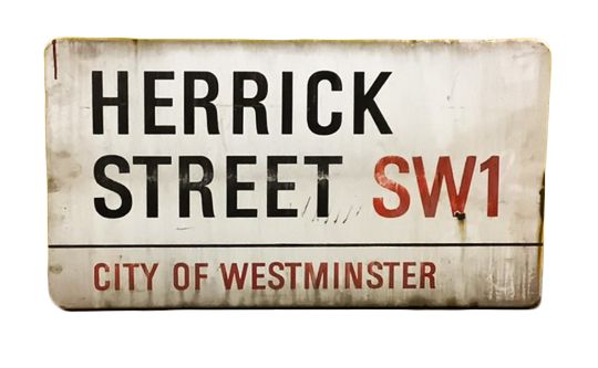 An enamelled steel street sign for Herrick Street SW1, City of Westminster with iconic black and red sans serif lettering first created by Sir Misha Black in 1967 which is unique to the Westminster signs and under copyright law, forbidden to be copied anywhere else in the world, sold together with a signed Certificate of Authenticity
