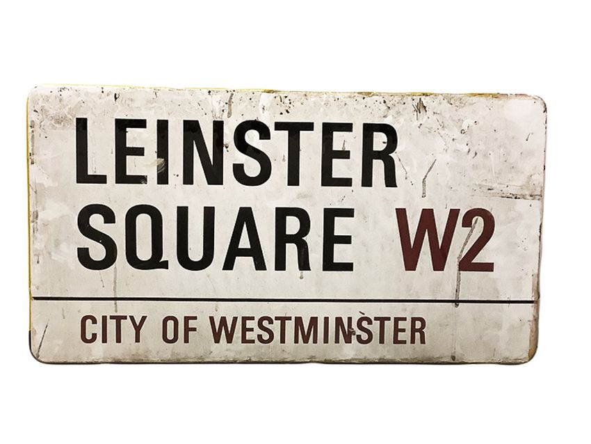An enamelled steel street sign for Leinster Square W2 City of Westminster with iconic black and red sans serif lettering first created by Sir Misha Black in 1967 which is unique to the Westminster signs and under copyright law, forbidden to be copied anywhere else in the world, sold together with a signed Certificate of Authenticity