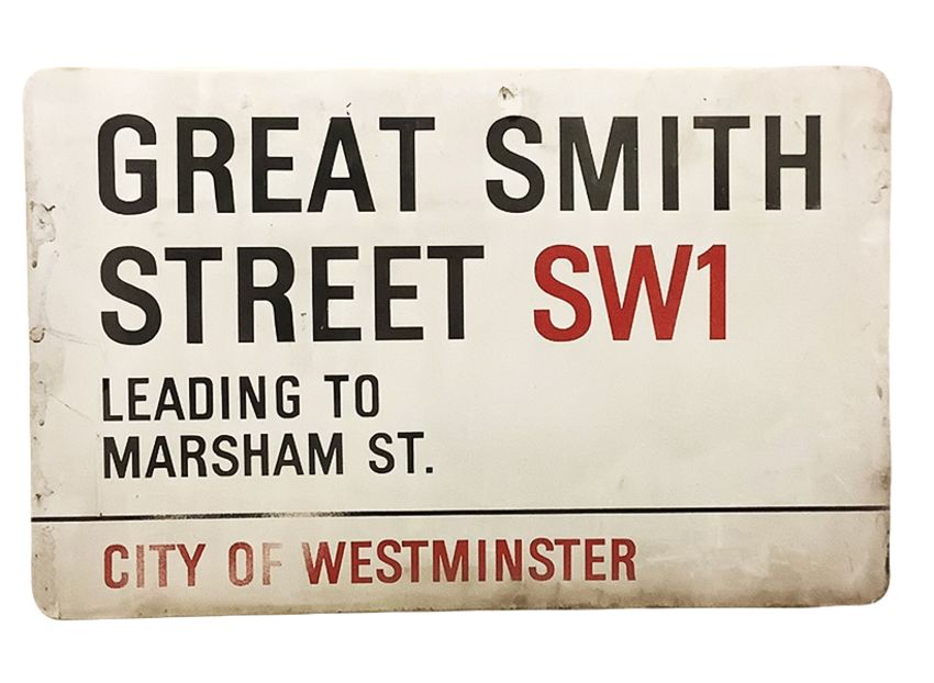 An enamelled steel street sign for Great Smith Street SW1 leading to Marshall St City of Westminster
