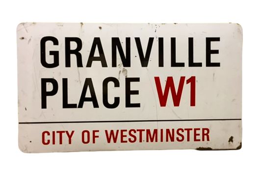 An enamelled steel street sign for Granville Place W1, City of Westminster with iconic black and red sans serif lettering first created by Sir Misha Black in 1967 which is unique to the Westminster signs and under copyright law, forbidden to be copied anywhere else in the world, sold together with a signed Certificate of Authenticity