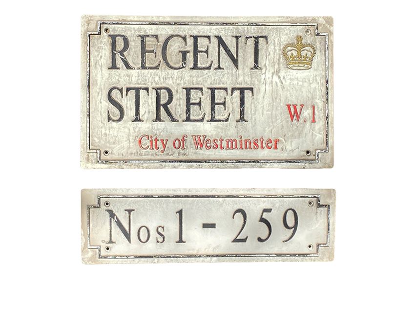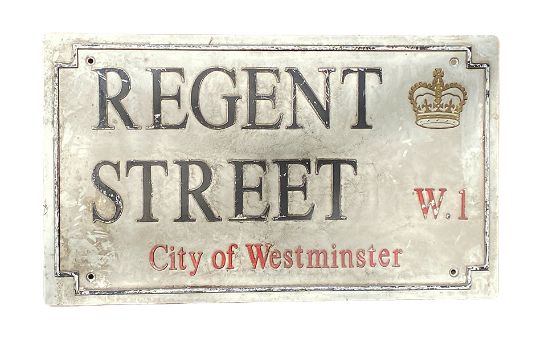 A cast aluminium street sign for Regent Street W1 and the additional Numbers sign situated at the Oxford Circus, Regents Street Crossroads (No's 1 - 259)