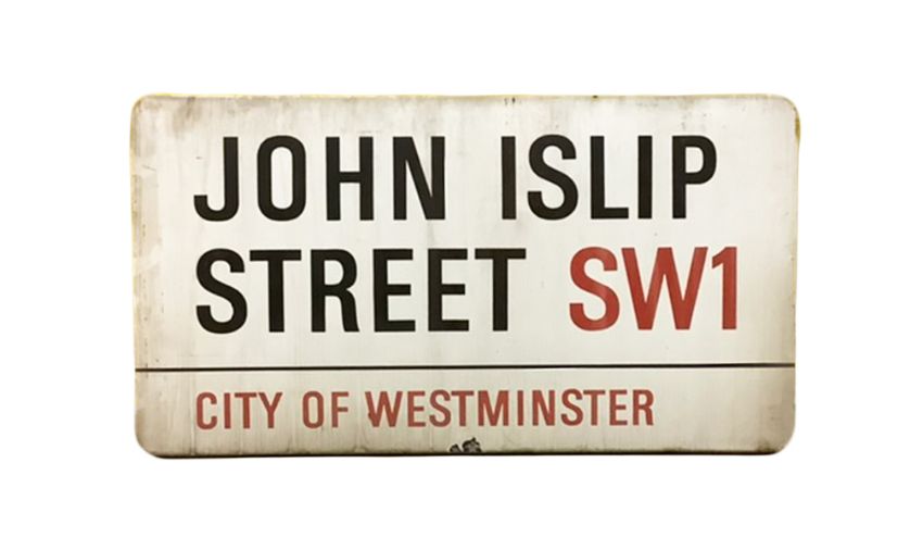 An enamelled steel street sign for John Islip Street SW1, City of Westminster with iconic black and red sans serif lettering first created by Sir Misha Black in 1967 which is unique to the Westminster signs and under copyright law, forbidden to be copied anywhere else in the world, sold together with a signed Certificate of Authenticity