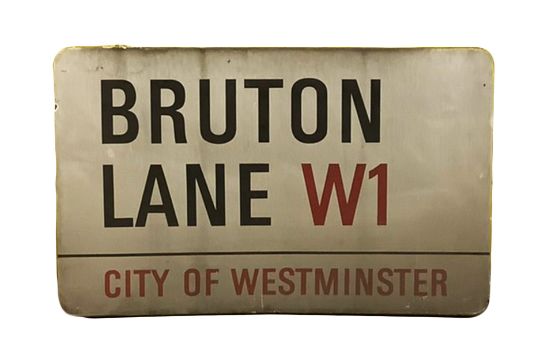An enamelled steel street sign for Bruton Lane W1, City of Westminster