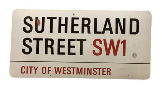 An enamelled steel street sign for Sutherland Street SW1, City of Westminster with iconic black and red sans serif lettering first created by Sir Misha Black in 1967 which is unique to the Westminster signs and under copyright law, forbidden to be copied anywhere else in the world, sold together with a signed Certificate of Authenticity