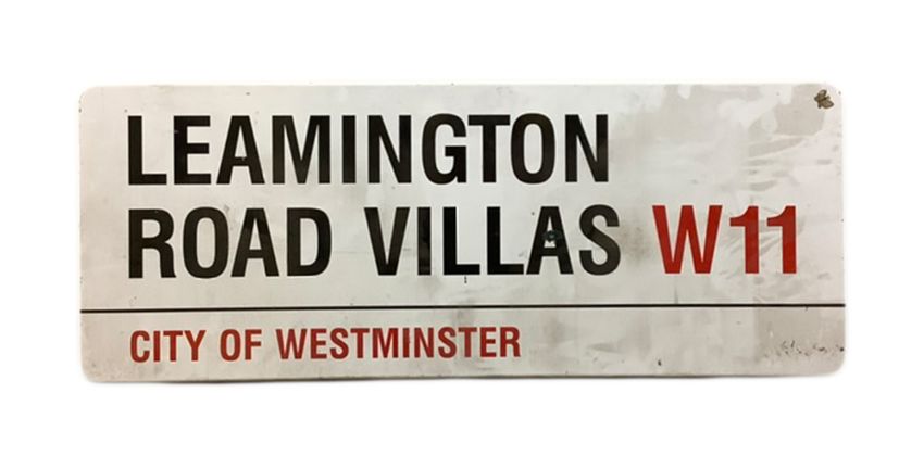 An enamelled steel street sign for Leamington Road Villas W11, City of Westminster with iconic black and red sans serif lettering first created by Sir Misha Black in 1967 which is unique to the Westminster signs and under copyright law, forbidden to be copied anywhere else in the world, sold together with a signed Certificate of Authenticity