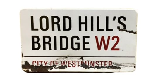An enamelled steel street sign for Lord Hills Bridge W2, City of Westminster with iconic black and red sans serif lettering first created by Sir Misha Black in 1967 which is unique to the Westminster signs and under copyright law, forbidden to be copied anywhere else in the world, sold together with a signed Certificate of Authenticity